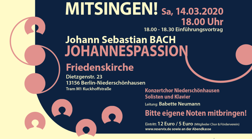 Liebe Interessierte, aus bekannten Gründen werden wir unser Mitsingformat und die Aufführung der Johannespassion auf den September (höchtwahrscheinlich) verschieben. Geplant: Mitsingformat 13.9.2020 Johannespassion 19. oder 26.9.2020 Wir bitten um Verständnis! 18.00 – 18.30 Uhr Einführungsvortrag. Johann Sebastian BACH: JOHANNESPASSION (Version II) Konzertchor Niederschönhausen Solisten und Klavier Leitung: Babette Neumann Bitte eigene Noten mitbringen! Eintritt: 12 Euro / 5 Euro (Mitglieder Chor & Förderverein) Karten über sowie an der Abendkasse.