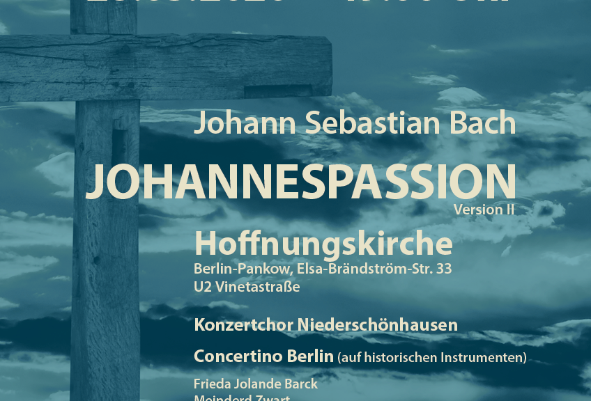 Liebe Interessierte, aus bekannten Gründen werden wir unser Mitsingformat und die Aufführung der Johannespassion auf den September (höchtwahrscheinlich) verschieben. Geplant: Mitsingformat 13.9.2020 Johannespassion 19. oder 26.9.2020 Wir bitten um Verständnis! Am Samstag, den 28. März erklingt um 19.00 Uhr die Johannespassion von Johann Sebastian Bach in der Hoffnungskirche Pankow (Elsa-Brändström-Str. 33, 13189 Berlin). Sie können eine wundervolle Musik erleben. Der Konzertchor Niederschönhausen, fünf Solisten und das Orchester „Concertino Berlin“ werden diese zweite Fassung der Johannespassion aus dem Jahr 1725…