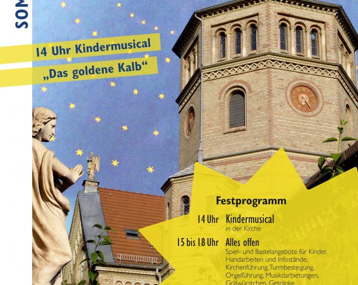 Am Sonntag, dem 25. August feiert Friedenskirche Niederschönhausen in und rund um die Kirche Ihr Sommerfest. Um 14 Uhr beginnen die Kinderchöre mit dem Musical “Das Goldene Kalb”. Danach gibt es Gegrilltes, Kaffen und Kuchen. Neben Spiel- und Bastelangeboten, gibt es Kirchenführung und lockt die gute Aussicht vom Kirchturm. Schon mal ganz oben gewesen? Der Konzertchor wird ab 15:00 Uhr einzelne Stücke aus dem aktuellen Programm „Geschwisterpaare“ zu Gehör bringen. Den Anschluss bildet um 18 Uhreine Andacht mit den Konfirmanden.