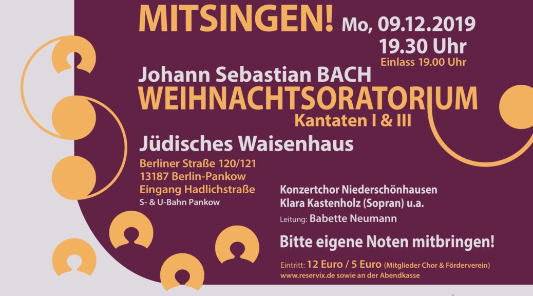 Der Konzertchor der Friedenskirche Niederschönhausen lädt wie schon im letzten Jahr unter dem Motto „Aufschlagen und mitsingen“ für den 9. Dezember zu einem Mitsingkonzert ins Jüdische Waisenhaus ein. Auf dem Programm stehen die Kantaten1und 3 des ›Weihnachtsoratoriums‹ von Johann Sebastian Bach. Willkommen sind Sängerinnen und Sänger, die dieses Werk bereits einmal mitgesungen haben. Bitte eigene Noten mitbringen. Beginn:19:30 Uhr Leitung: Babette Neumann Ort: Jüdisches Waisenhaus, Berlin-Pankow, Berliner Straße120/121, Eingang Hadlichstraße, nahe S- und U-Bahn Pankow Karten zu 12 € können…